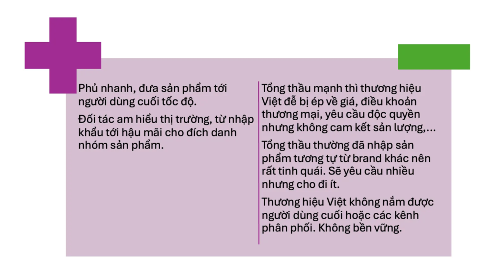 Lý do khiến mô hình này được nhiều doanh nghiệp lựa chọn nằm ở tốc độ. So với việc tự xây dựng thị trường từ con số không, đi qua tổng thầu giúp rút ngắn thời gian tiếp cận người tiêu dùng một cách đáng kể. Điều này đặc biệt quan trọng với những ngành hàng cần độ phủ offline lớn như FMCG, thiết bị gia dụng hay các sản phẩm phụ thuộc mạnh vào hệ thống bán lẻ truyền thống (sản phẩm cần lắp đặt, cồng kềnh,..). Trong nhiều trường hợp, nếu không đi qua nhà phân phối, doanh nghiệp gần như không có cửa để tiếp cận người tiêu dùng cuối.