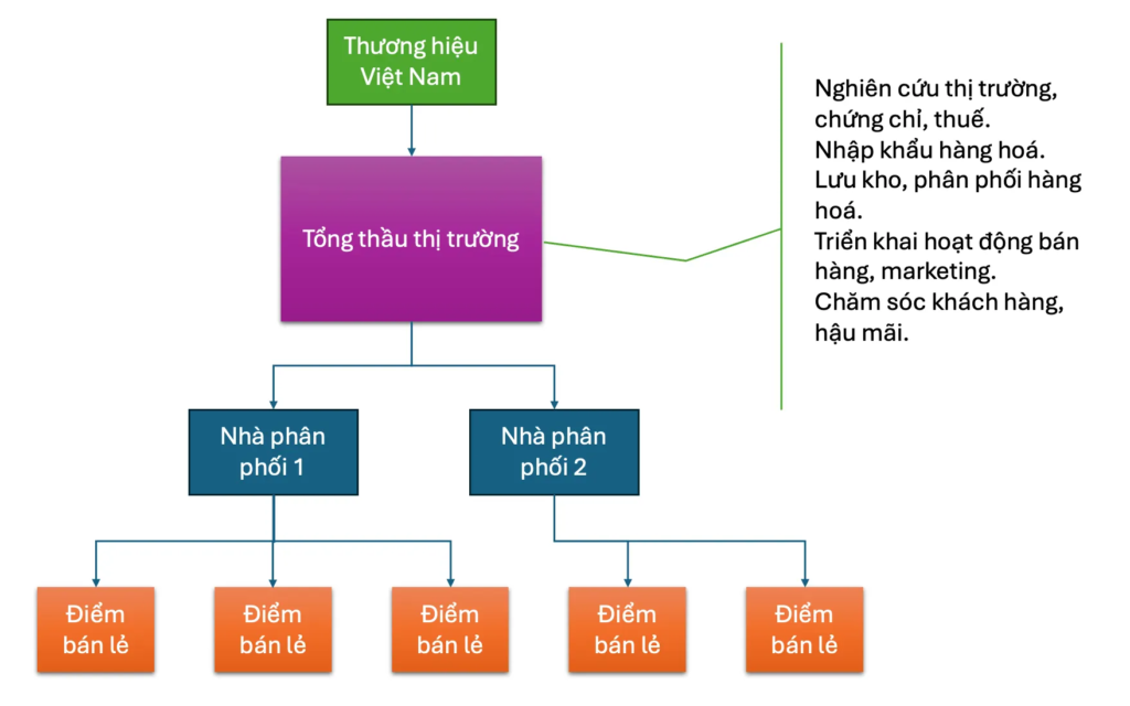 Những đối tác này thường đã có pháp nhân hợp pháp, hệ thống kho bãi, mạng lưới đại lý hoặc chuỗi bán lẻ, cùng với kinh nghiệm xử lý các vấn đề liên quan tới tiêu chuẩn, thuế và thủ tục. Về bản chất, doanh nghiệp Việt tập trung vào việc sản xuất, kiểm soát chất lượng và giá thành, còn nhà phân phối chịu trách nhiệm đưa sản phẩm ra thị trường và bán hàng.