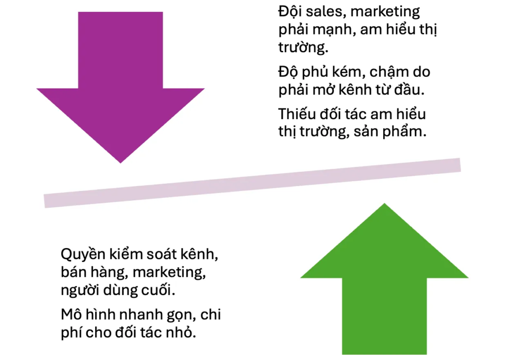Mô hình đi qua tổng thầu vì vậy phù hợp nhất trong những trường hợp doanh nghiệp muốn đi nhanh, ưu tiên doanh số hơn là quyền kiểm soát, hoặc chưa đủ năng lực để tự quản trị hoạt động bán hàng từ xa. Đổi lại, doanh nghiệp cần chấp nhận biên lợi nhuận thấp hơn, ít nắm dữ liệu khách hàng và phụ thuộc nhiều vào đối tác tại thị trường.